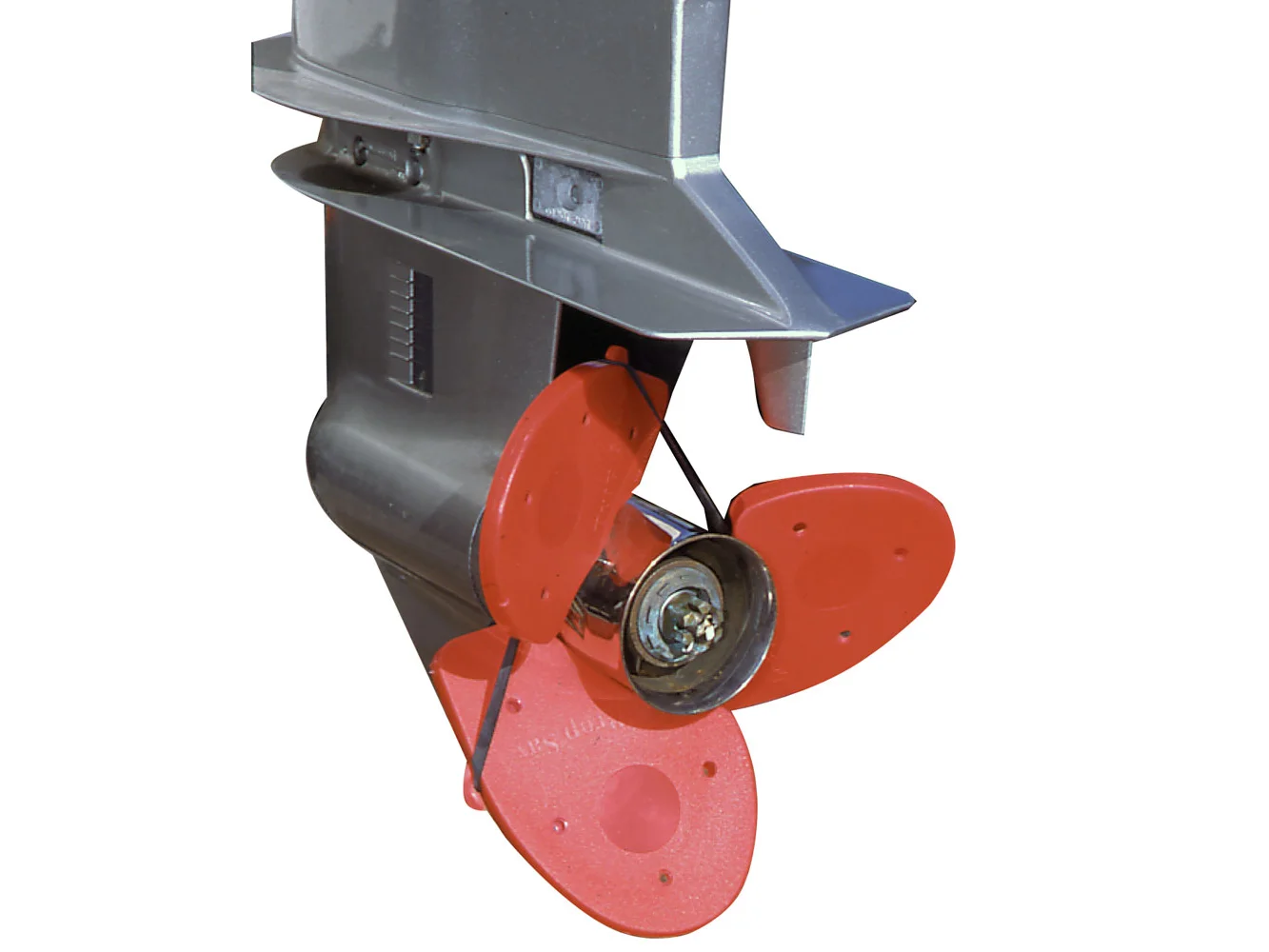 Prop Sox are made of bright plastic and simply slip over each propeller blade. The sox are held in place with a rubber cinch strap. Set of three socks, cinch straps and 3 reflector hot-dots included. For use when your boat is out of the water only.