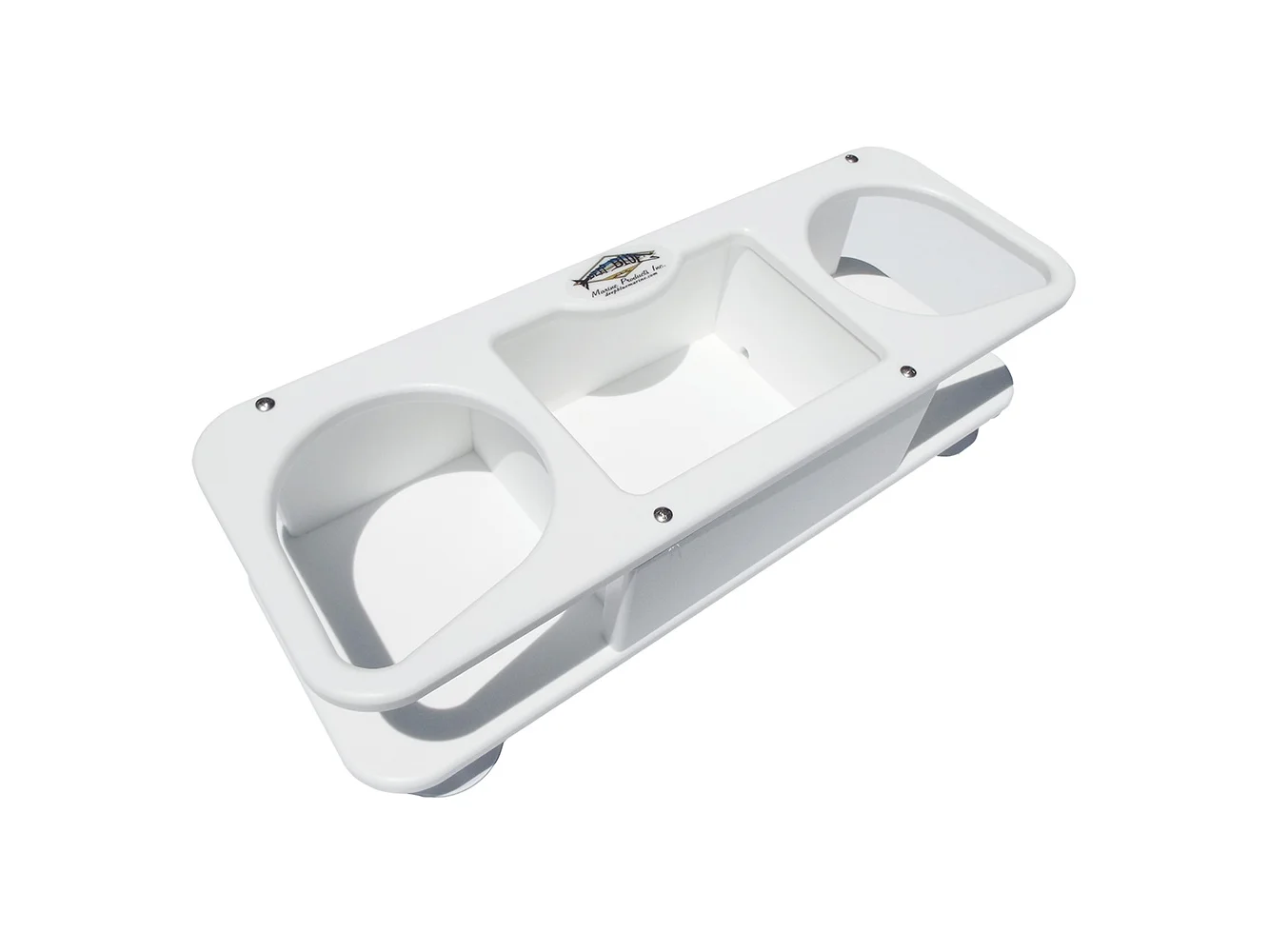 This heavy duty drink holder/storage box is designed to mount horizontal surfaces with suction cups or permanently mounted vertically with screws and hold insulated cans and bottles, most bottled water containers, and handled mugs. The center storage box measures approximately 3 1/2 x 5 x 3 deep and is ideal for cell phones, sunglasses, sunscreen, fishing gear, and more. Product Dimensions 14 1/8" x 5 1/8" x 3 1/4". See our complete line of cup holders, we make a version for nearly every occasion. Lifetime warranty.