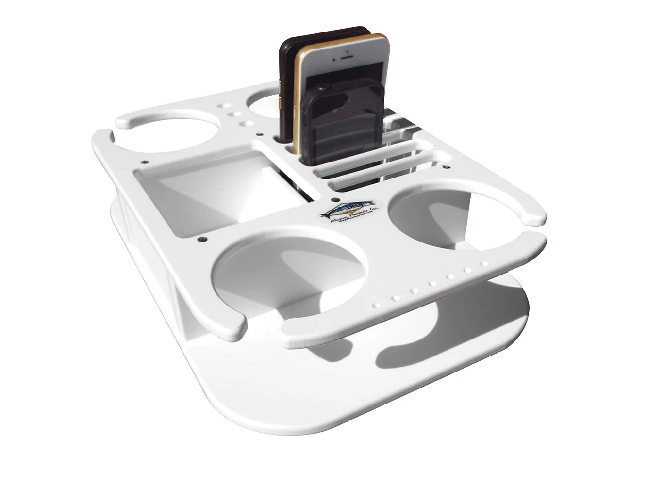 Have phones? Have friends with phones? The BH-4Cell can help! Holds up to five phones (fits phones with waterproof cases), also can hold four drinks. Has a storage box for all the other loose items that end up everywhere. Overall dimensions: 9 3/4" x 14" x 3". Box Dimensions: 4" x 4 1/4" x 3" deep and will fit everything from wallet to cameras to sunscreen, etc. 3.5" Diameter cup hole size Comes with four suction cups, or can be permanently mounted. Made out of Starboard, lifetime warranty. Made in America, tested on the water!
