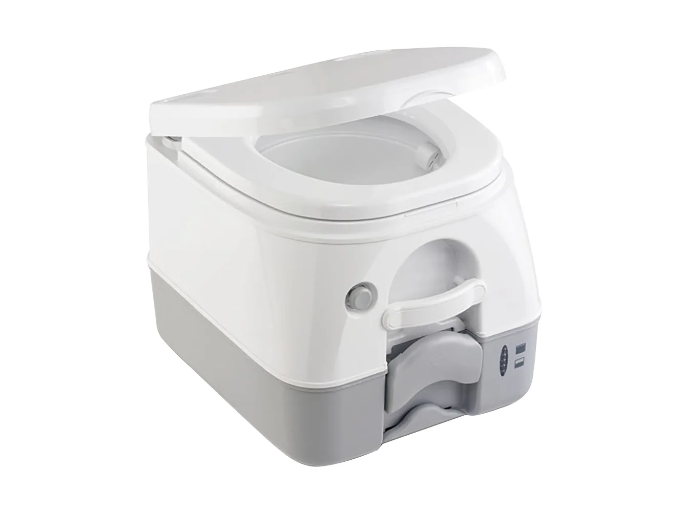 Powerful flushing at the touch of a button sets the new 970 portable toilet series apart from the rest. Requires no manual pumping or batteries, yet delivers a robust bowl-clearing flush every time. The 9.8 L tank, with a tank level indicator, contains enough water for 27 flushes. When it is time to empty it, the extra long discharge pipe is a sure safeguard against mess.