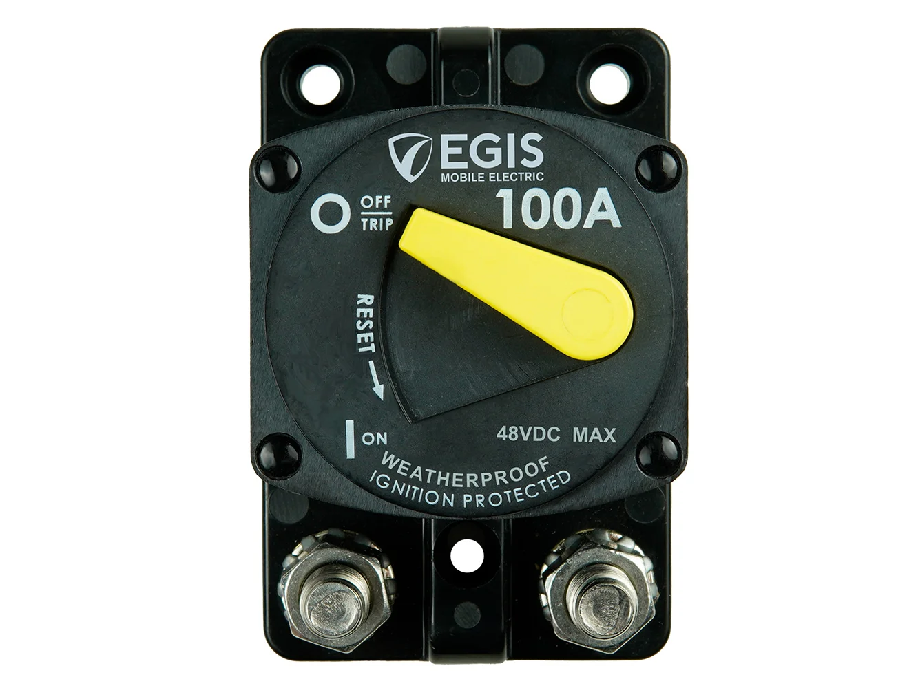 This 100A Egis circuit breaker protects electrical circuits from short-circuit events and over-current loads, preventing wire insulation overheating and subsequent destruction.