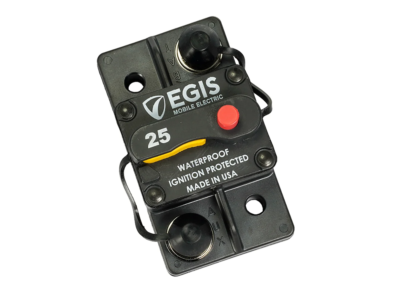 This 25A Egis circuit breaker protects electrical circuits from short-circuit events and over-current loads, preventing wire insulation overheating and subsequent destruction.