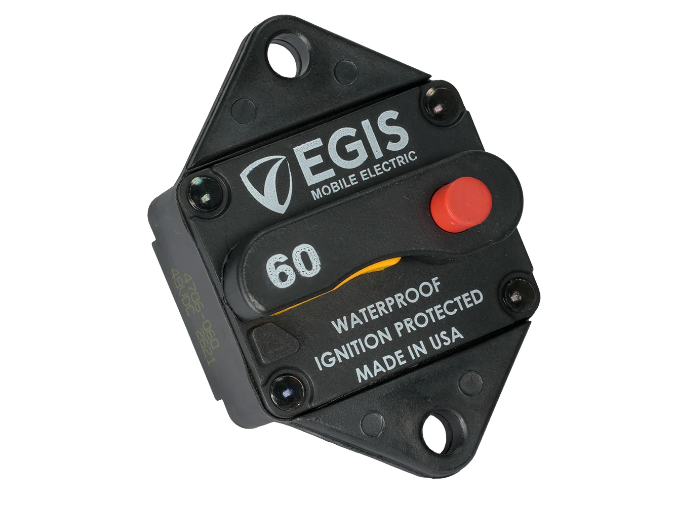 This 60A Egis panel mount circuit breaker protects electrical circuits from short-circuit events and over-current loads, preventing wire insulation overheating and subsequent destruction.