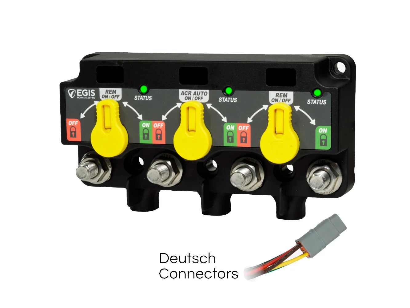 The Egis relay replaces three individual high-amp relays with one compact module, reducing space significantly, eliminating the cost of external link cable connections, eliminating the risk of link cable connections vibrating loose, and providing clear, unambiguous awareness of how to operate manual controls and what state the manual controls have forced the relay into.
