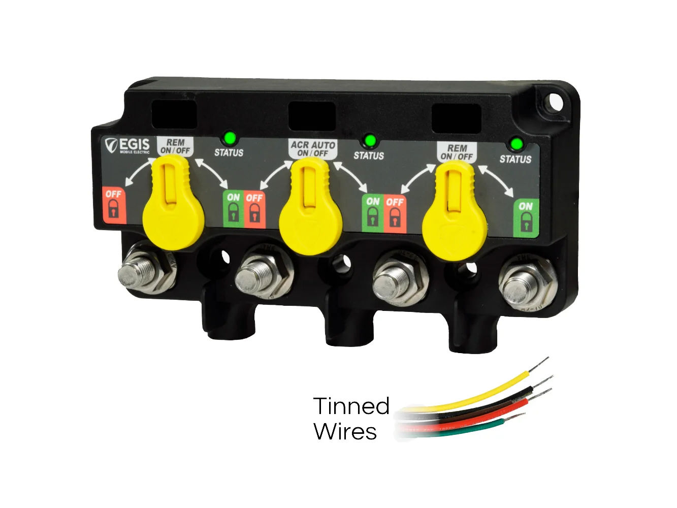 The Egis relay replaces three individual high-amp relays with one compact module, reducing space significantly, eliminating the cost of external link cable connections, eliminating the risk of link cable connections vibrating loose, and providing clear, unambiguous awareness of how to operate manual controls and what state the manual controls have forced the relay into.