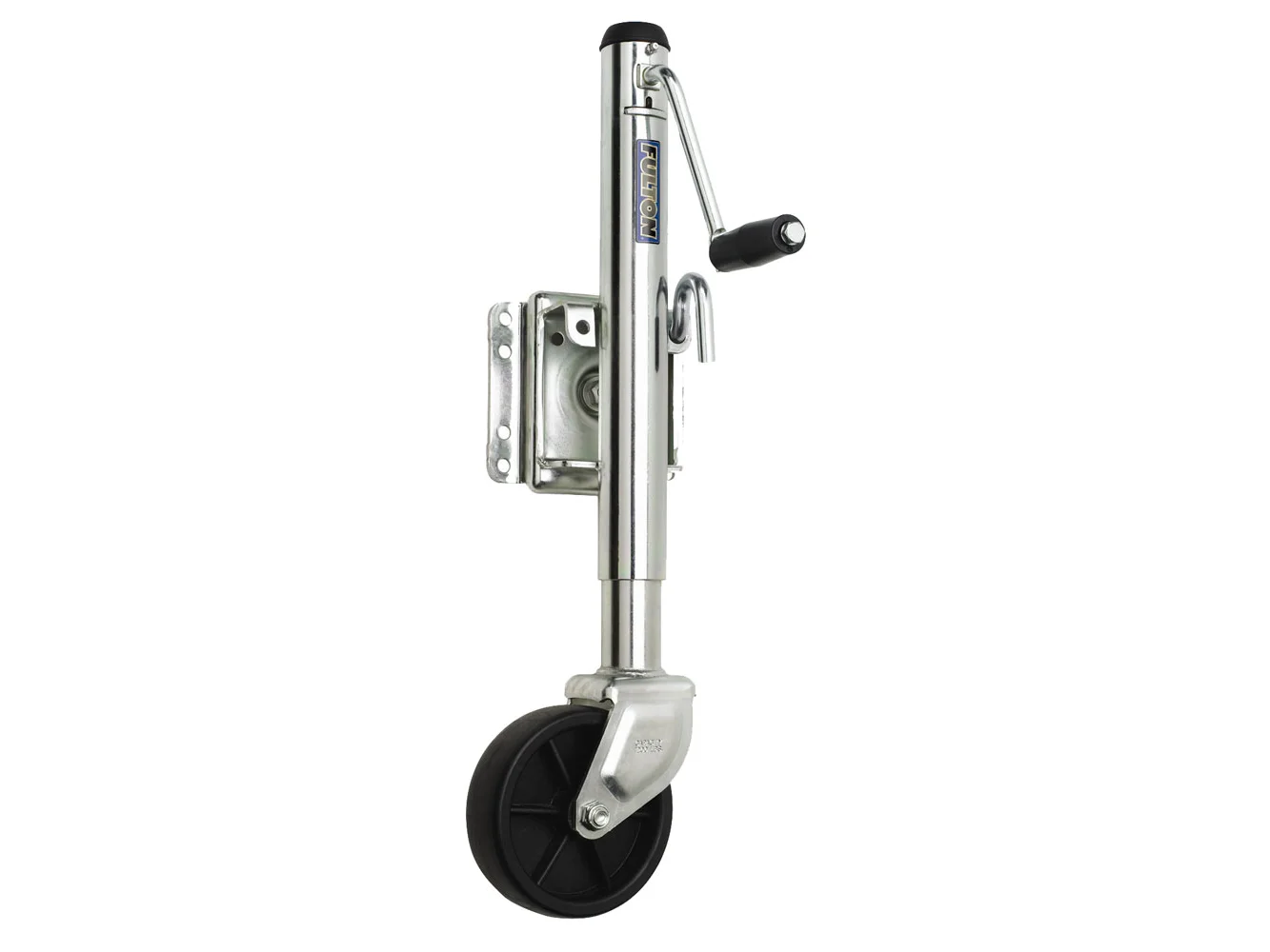 Fulton Bolt Thru Swivel Jacks feature swing-away design, with bolt thru mounting. Heavy duty steel construction with a zinc finish for corrosion resistance. 10″ of travel with 6″ poly wheel.