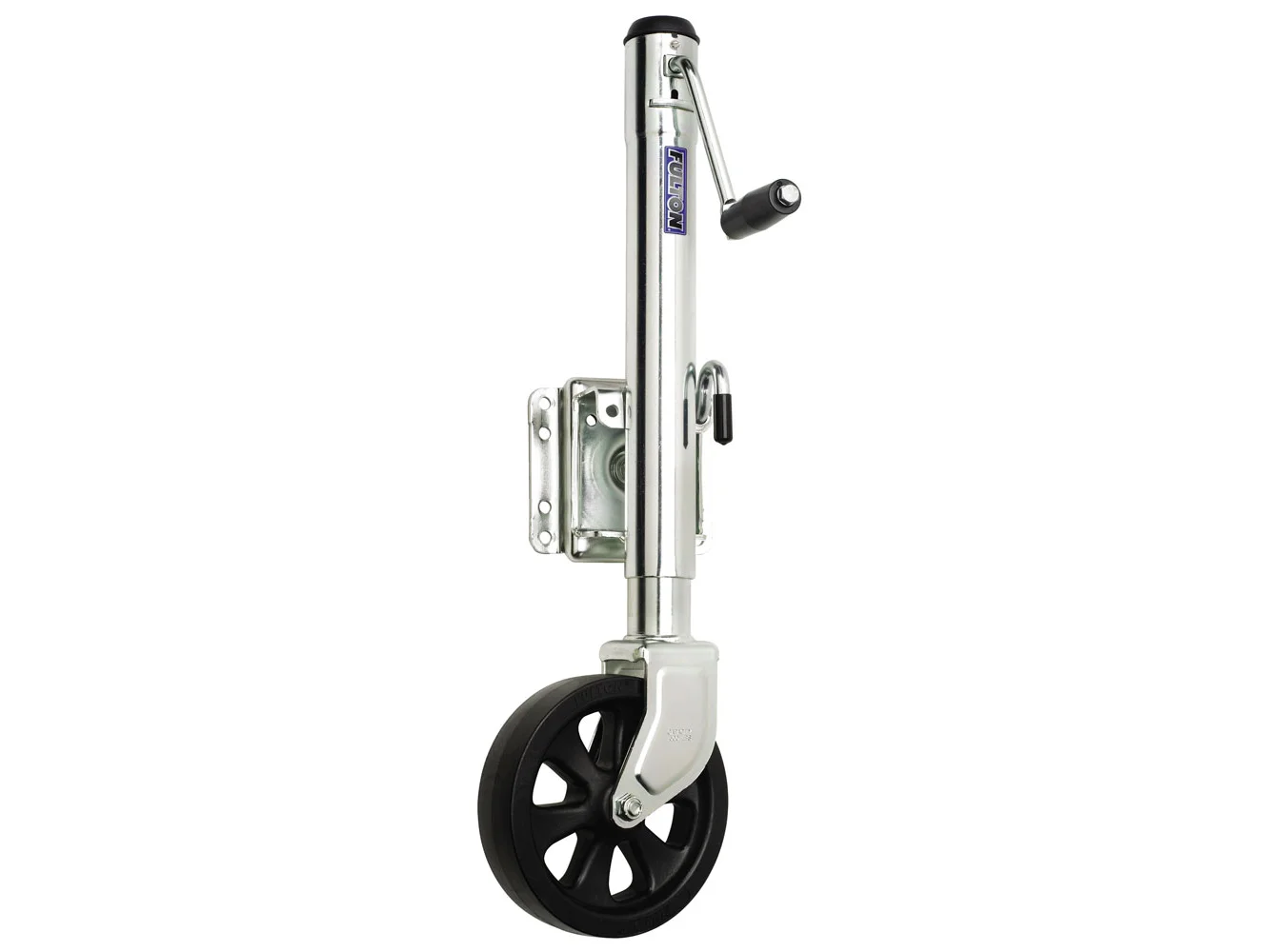 Fulton Bolt Thru Swivel Jacks feature swing-away design, with bolt thru mounting. Heavy duty steel construction with a zinc finish for corrosion resistance. 12″ of travel with 8″ poly wheel.