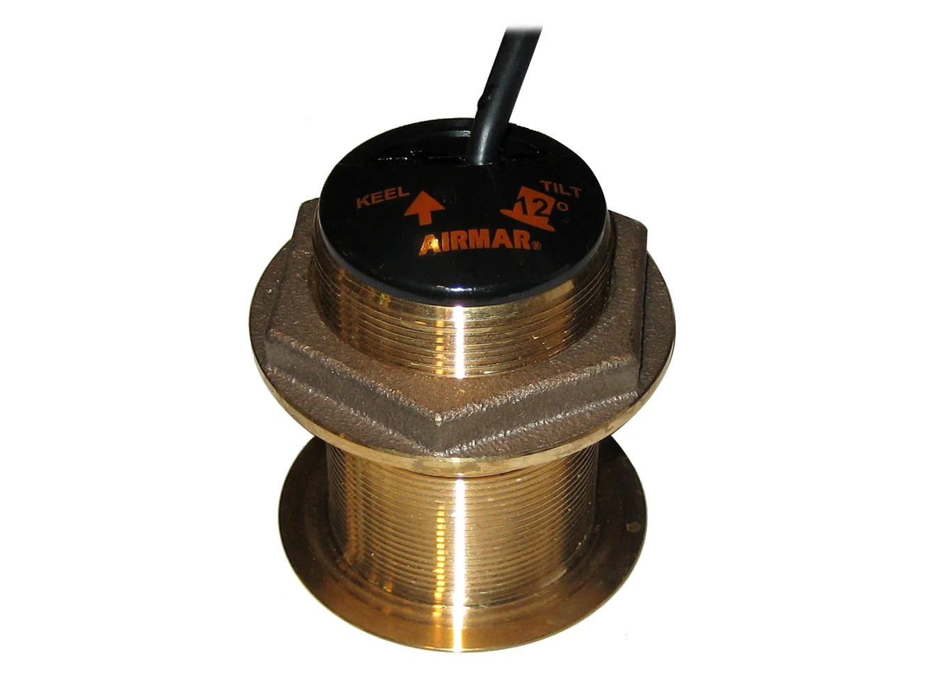 The bronze B60-12° provide a vertical beam without a fairing. Inside the housing, the ceramic element is tilted to provide built-in deadrise compensation. The resulting vertical beam provides excellent echo returns for more accurate depth readings. The nearly flush housing minimizes drag with only 5 mm (3/16") extending outside of the hull.