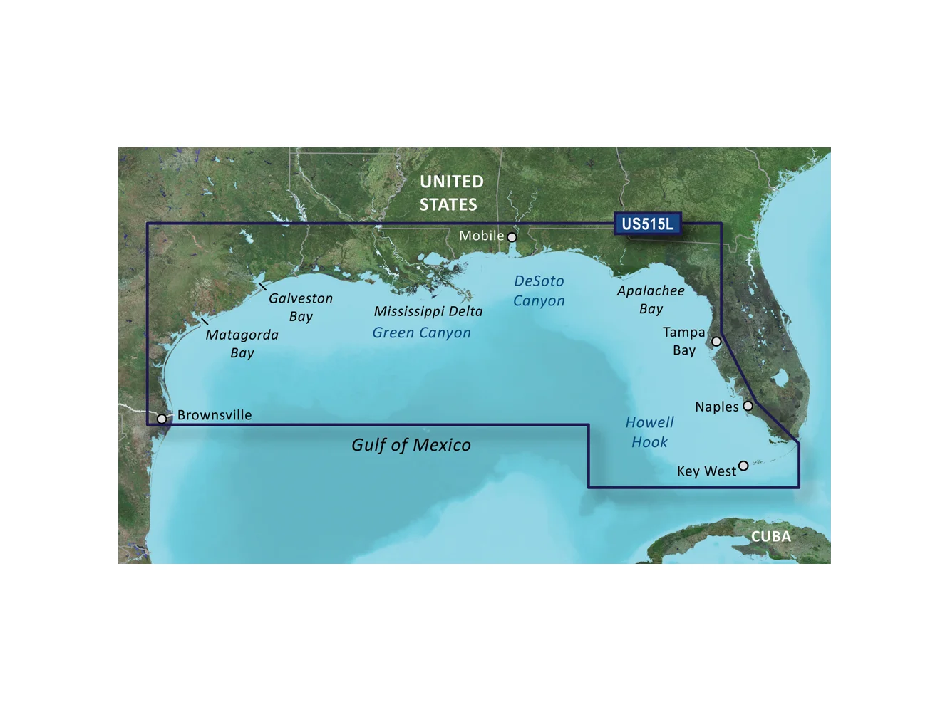 Detailed coverage of the Gulf of Mexico from Brownsville, TX to Plantation Key, FL including Corpus Christi, TX, Matagorda Bay, Galveston Bay, Port Arthur, TX, Atchafalaya Bay, the Mississippi Delta, Chandeleur Islands, Tampa Bay and the Florida Keys west of Key Largo. Also includes Lake Ponchartrain and Lake Maurepas to Vermilion Bay and Lake Calcasieu. Bathymetric coverage of offshore features from Vernon Basin to Alaminos Canyon including DeSoto Canyon, Mississippi Canyon and Green Canyon.
