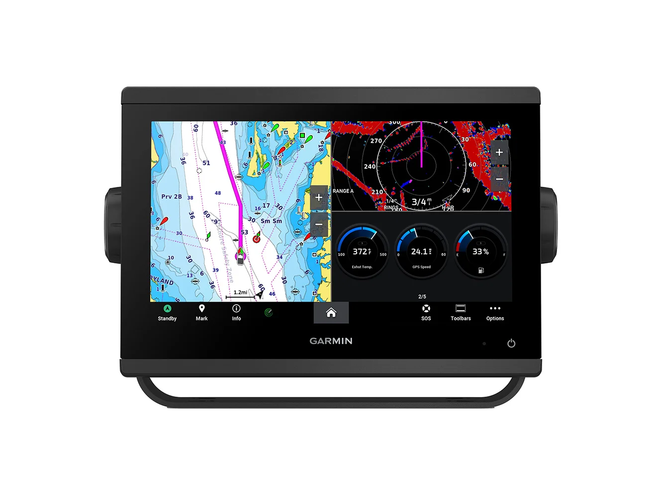 Get a sharper view from your connected helm with the GPSMAP® 943 chartplotter. Its higher-resolution 9” in-plane switching display has 50% more pixels than previous-generation chartplotters. The ultra-sleek design and nearly double the processing power of previous-generation GPSMAP devices offer seamless integration into your Garmin marine system. Preloaded Garmin Navionics+™ coastal charts and inland mapping feature Auto Guidance+™ technology (Auto Guidance+ is for planning purposes only and does not replace safe navigation operations) for helping you get where you need to go. Plus, there’s support for optional Garmin Navionics Vision+™ premium map content. Easily build your marine system — from compatible sonar and autopilots to compatible radar, cameras and multimedia — by using HTML 5.0, NMEA 2000® and NMEA 0183 networking, J1939 for engines, and the Garmin Marine Network. Add FrontVü™ forward-looking sonar (sold separately) for help in avoiding underwater obstructions ahead. Or pair your plotter with your other compatible Garmin devices, such as quatix® smartwatches, wind transducers, wireless remote controls, and more.