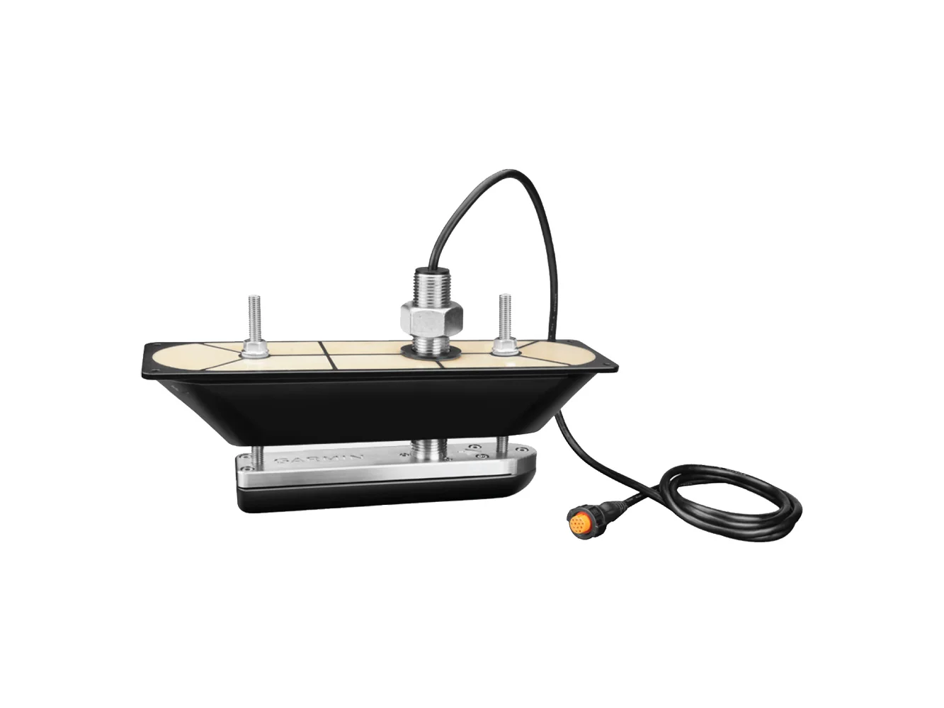 This transducer with built-in fast response temperature sensor has a power rating of 500 W per element (1,500 W total); a depth of 750 ft (DownVü) and 500 ft left and right (SideVü) an operating frequency of CHIRP 455/800 kHz; for hull deadrises less than 5 degrees. Pair it with your GCV™ 10 scanning sonar module.