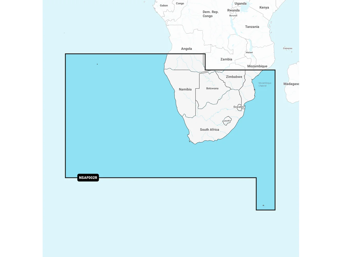Coastal coverage of southern Africa from Namibe, Angola to the Zambezi Delta in Mozambique. Includes detailed coverage of Cape Town, Port Elizabeth, East London and Durban in South Africa and Maputo, Mozambique. Also includes coverage of the Tristan da Cunha Islands, St. Helena Island, Gough Island and the Prince Edward Islands.