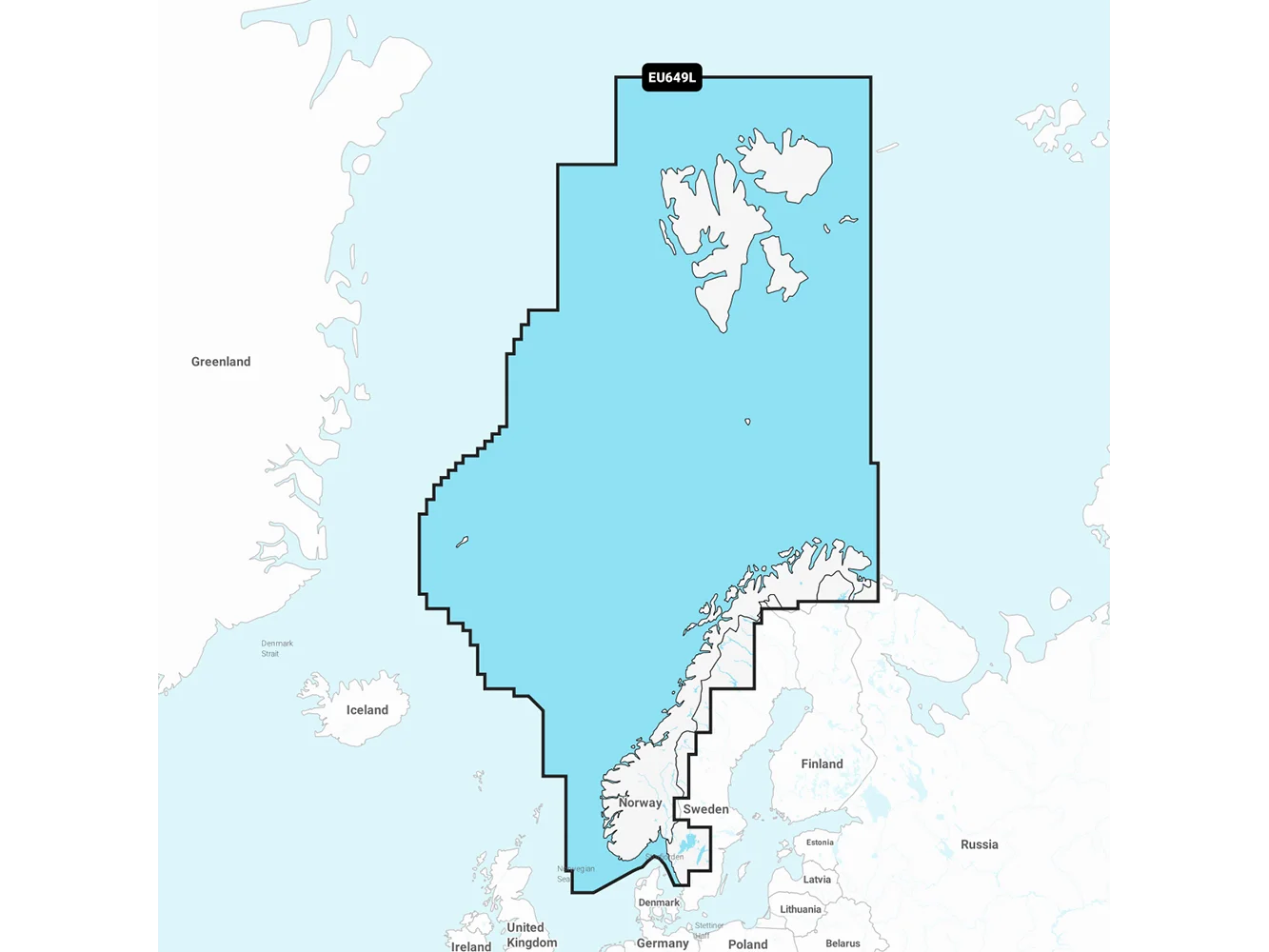 Detailed coverage of the entire coast of Norway and parts of Sweden. Coverage includes the Oslofjord; the Sognefjord; the Vestfjorden; Jan Mayen Island; Svalbard; Lakes Mjøsa, Bandak, Kviteseidvatnet, Flåvatn and Norsjø and the Telemark Canal in Norway; Lakes Vänern and Vättern and the Trollhätte and Göta Canals in Sweden. Ports include Gothenburg in Sweden and Kristiansand, Stavanger, Bergen, Trondheim, Tromsø and Narvik in Norway.