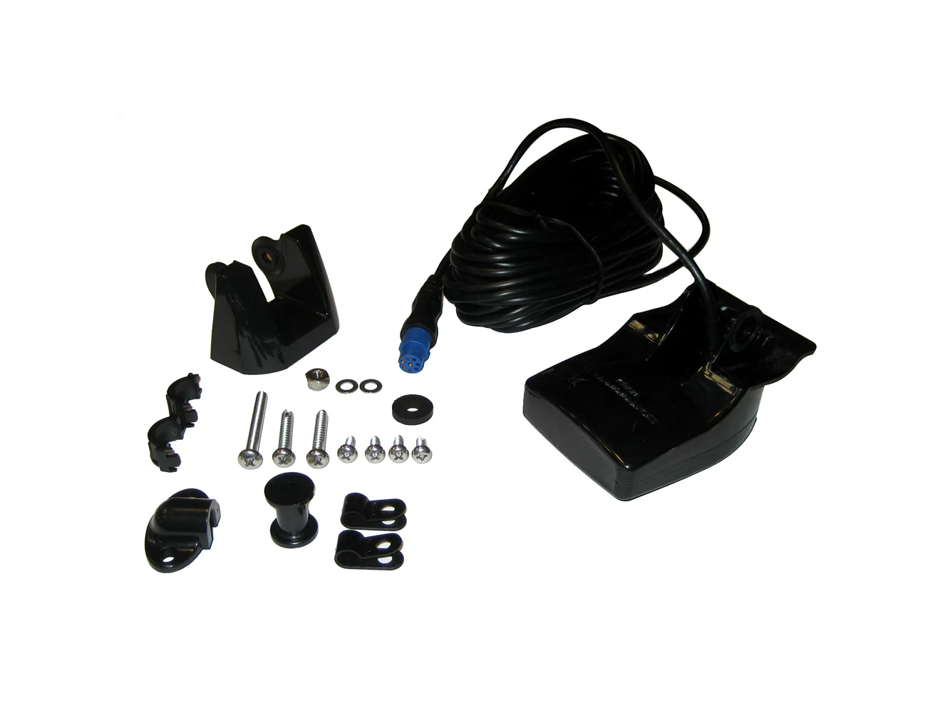 The 500 W 8-pin transducer has a maximum depth of 1,500 ft; an operating frequency of 50 to 200 kHz; a beamwidth of 40 to 10 degrees; and mounts on a 0 to 70 degree transom.