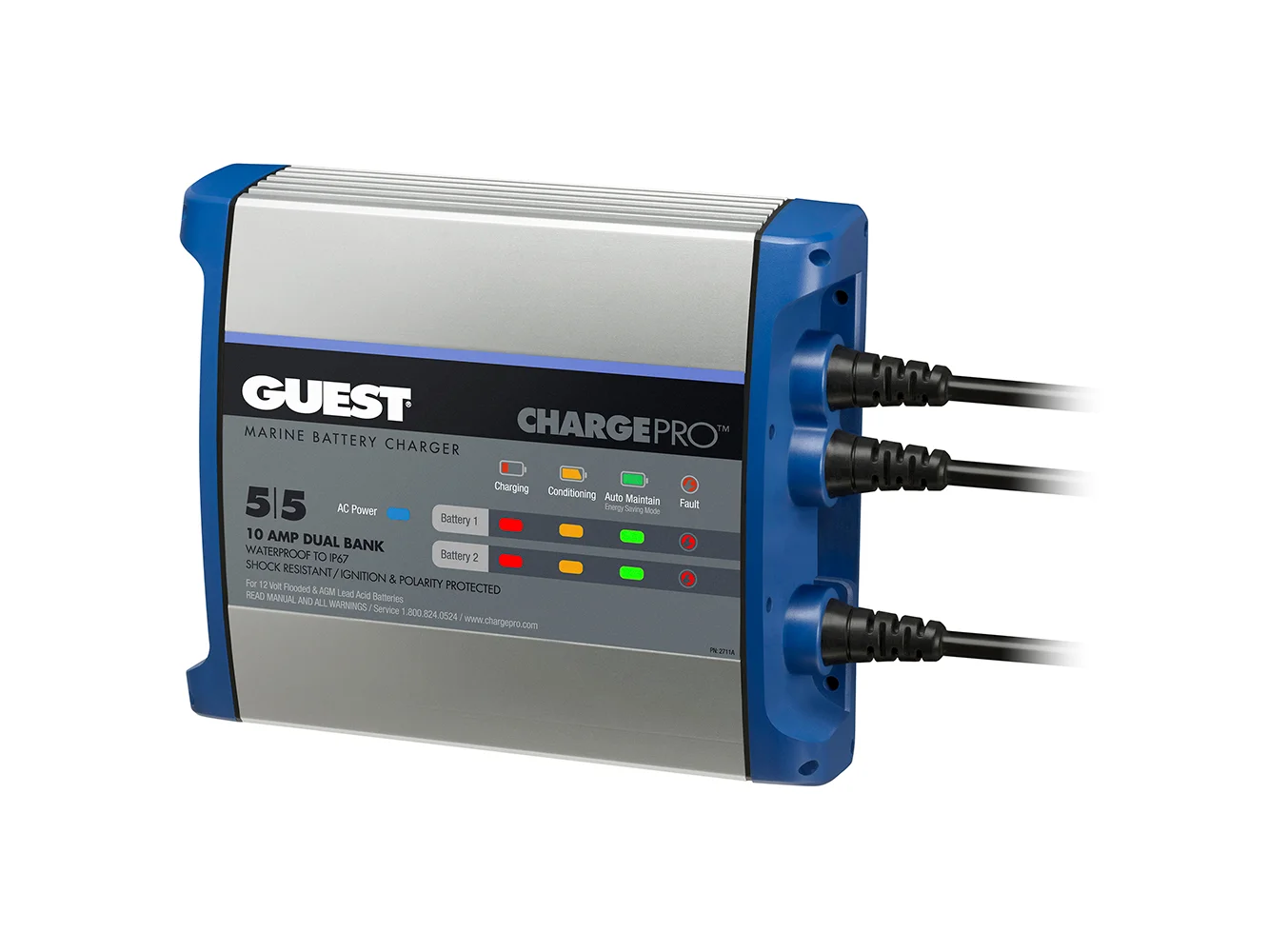 Guest On-Board battery chargers have been redesigned from the inside out with the customer in mind. Our newest generation On-Board Marine battery chargers include leading advancements in digital charging technology and waterproof design/construction. Every Guest charger has a dedicated charging, sensing and control per bank. The easy to read graphics indicates the status of each battery bank through the charging process.