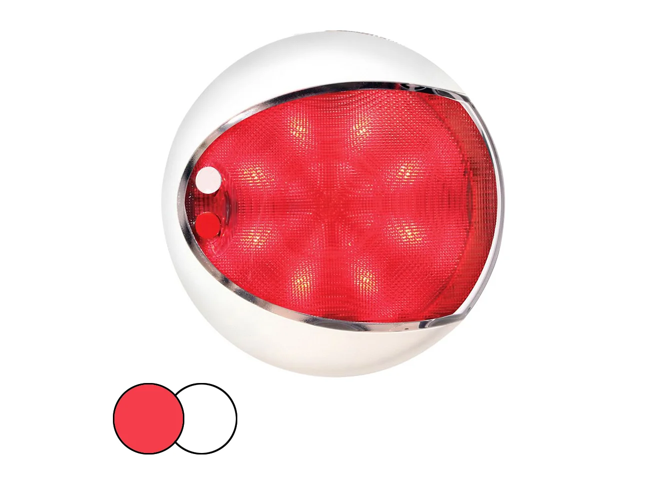 EuroLED® Touch current draw is 4W on white (0.33A @ 12V) and less than 1.5W on red or blue (less than 0.125A @ 12V) to provide significant power savings. Glare diffusion without light loss is important with any LED lamp to maintain efficiency and safety, particularly with powerful lamps such as the EuroLED® series. Without the protection of advanced optics, significant eye strain can result from periods of looking directly into a powerful LED point source. Advanced Hella marine lens technology provides a safe, smooth and uniform light pattern, without glare or discomfort.