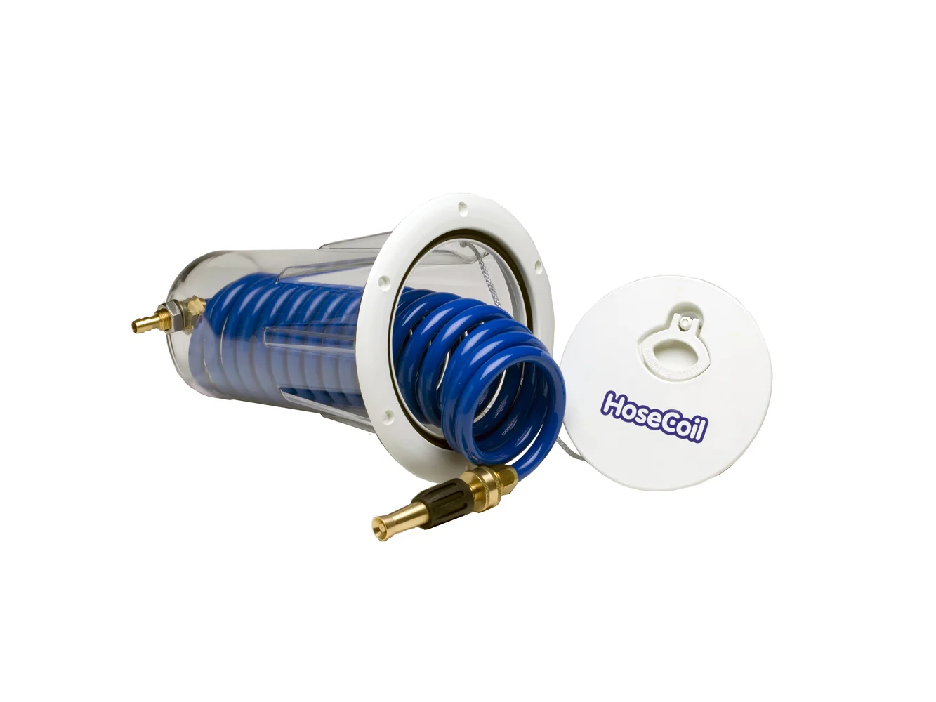 Featuring solid brass fittings and an adjustable brass nozzle with a rubber grip and rubber tip for fiberglass protection. HoseCoil is designed to connect directly into the boat’s internal pressurized water system.