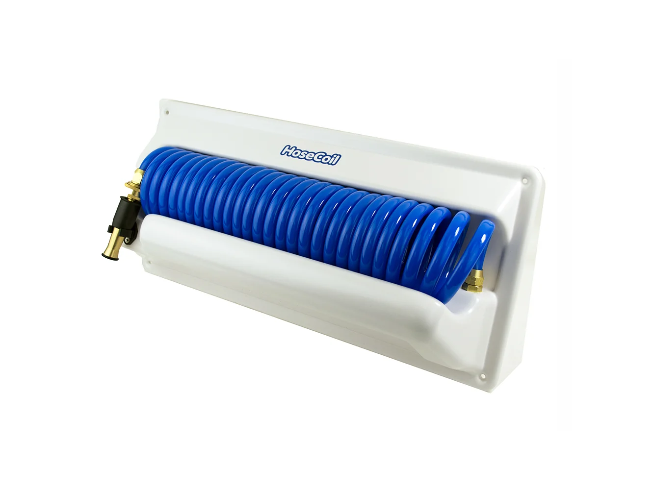 HoseCoil’s Horizontal Mount Enclosure is constructed of high density, durable ABS with high gloss UV protective coating. Included is a solid blue 5′ HoseCoil constructed of high performance polyether material. HoseCoil features solid brass fittings and an adjustable brass nozzle with a rubber grip and rubber tip for fiberglass protection.