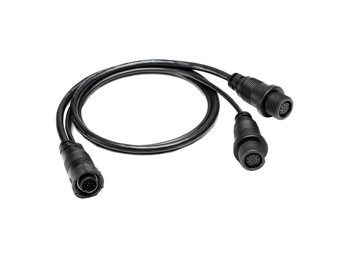 The 14 M ID SIDB Y cable allows for the installation of a separate 2D transducer paired with a Humminbird MEGA Imaging or non-MEGA Imaging transducer and connect both transducers to a single Humminbird control head. This y-cable provides the ability to install a separate high-speed Humminbird 2D transducer for high-speed depth reading and sonar performance. Alternatively, this cable can also be used to add an accessory Airmar® 2D transducer to a Humminbird control head that also has a Side or Down Imaging transducer connected at the same time. This cable supports Transducer ID for automatic recognition and easy setup of Airmar® accessory transducers.