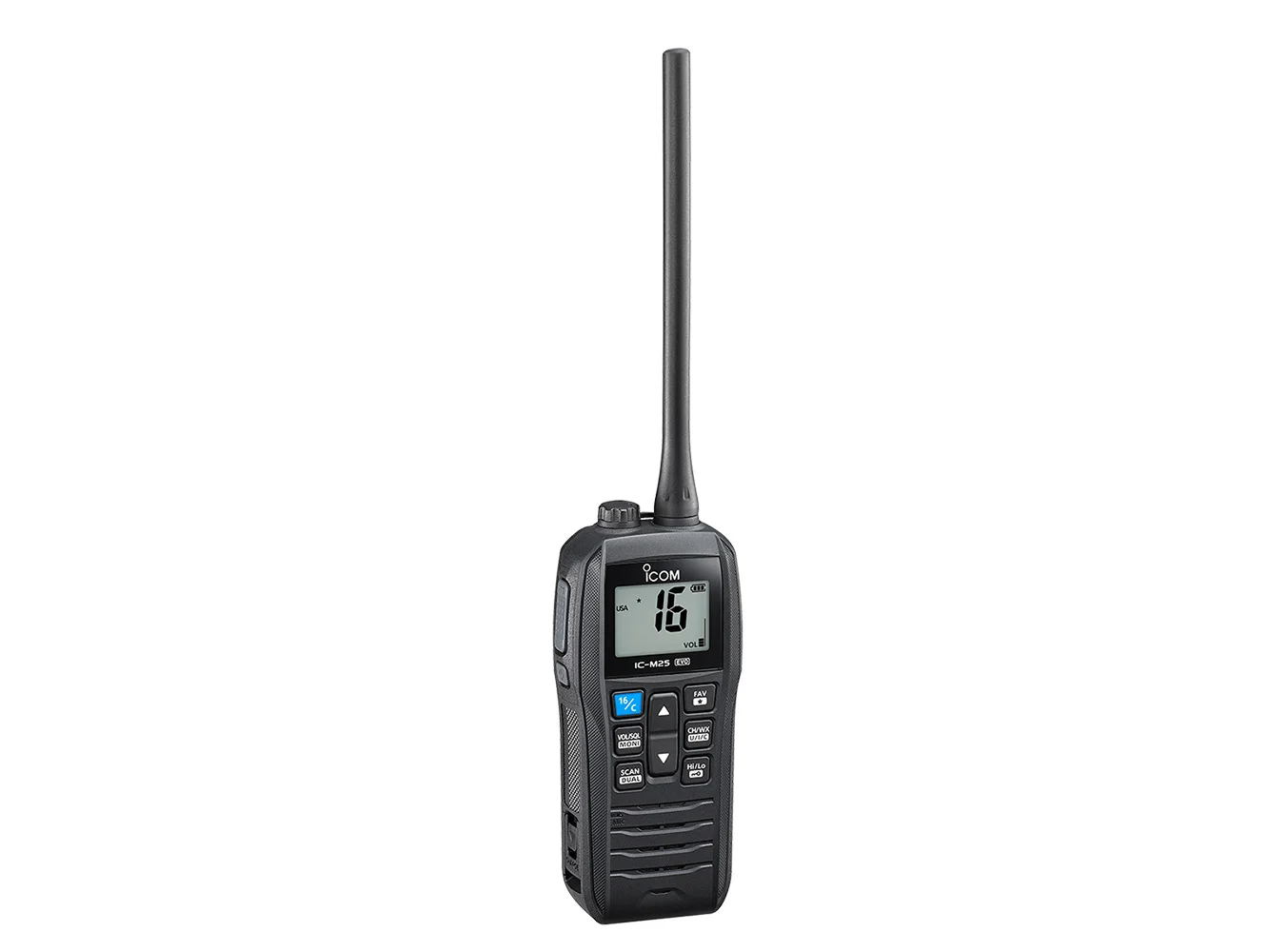 Floating VHF Radio with a Fresh Design for Marine Adventures. The IC-M25 EVO is an upgraded model of the extremely popular IC-M25 floating VHF marine handheld transceiver. It is designed with an improved grip texture for easier handling and larger buttons for easier operation. Moreover, it has adopted a new power-saving Eco Mode, which will allow approximately 14 hours of operation, which is about a 30% improvement. Furthermore, a USB Type-C™ charging port is standard. The IC-M25 EVO still retains its compact and lightweight body and industry-leading Float'n Flash™ and submersible design.