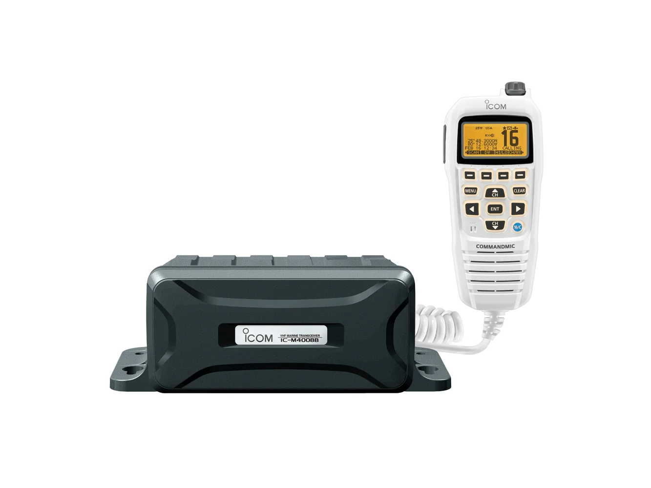 Icom’s M400BB is a VHF fixed mount with Class D DSC. The M400BB is a spacesaving unit, ideal for owners of compact boats and shipbuilders looking for a black box solution. The M400BB comprises only a black box main body and a supplied COMMANDMIC HM195 remote control microphone accessory. The two-piece radio set can easily be installed behind a wall or console-leaving a small or hidden footprint-and completely controlled from a remote position.