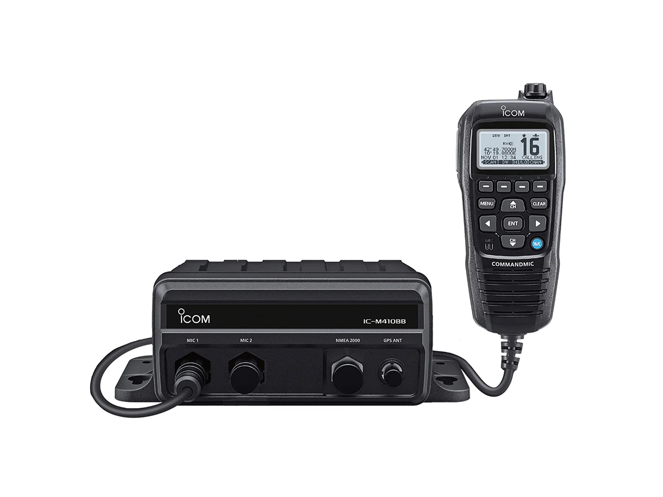 Icom’s M410BB is a flexible black box mounted on a fixed mount that provides VHF communications for vessels with limited helm space. The supplied black CommandMic™ controls the radio for essential communications on the water.
