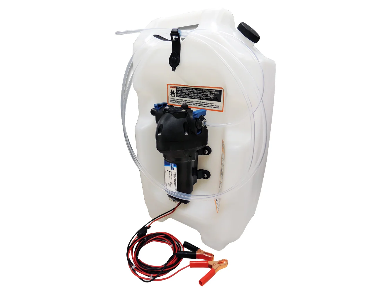 The Flat Tank design allows for easy storage in deck boxes, boat storage lockers, or RV storage compartments. Easy to use, clean and efficient dipstick suction tube, battery clamp wire leads, an on-off pump switch.