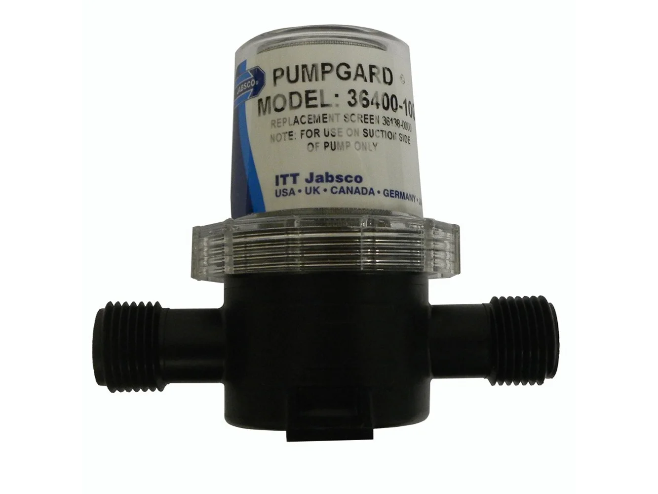 Prevents dirt from entering pump intake. Works in any position. Easy to install and clean. Has transparent housing and stainless steel mesh filtering screen. Jabsco Pumpguard in-line strainers make great filtering agent.