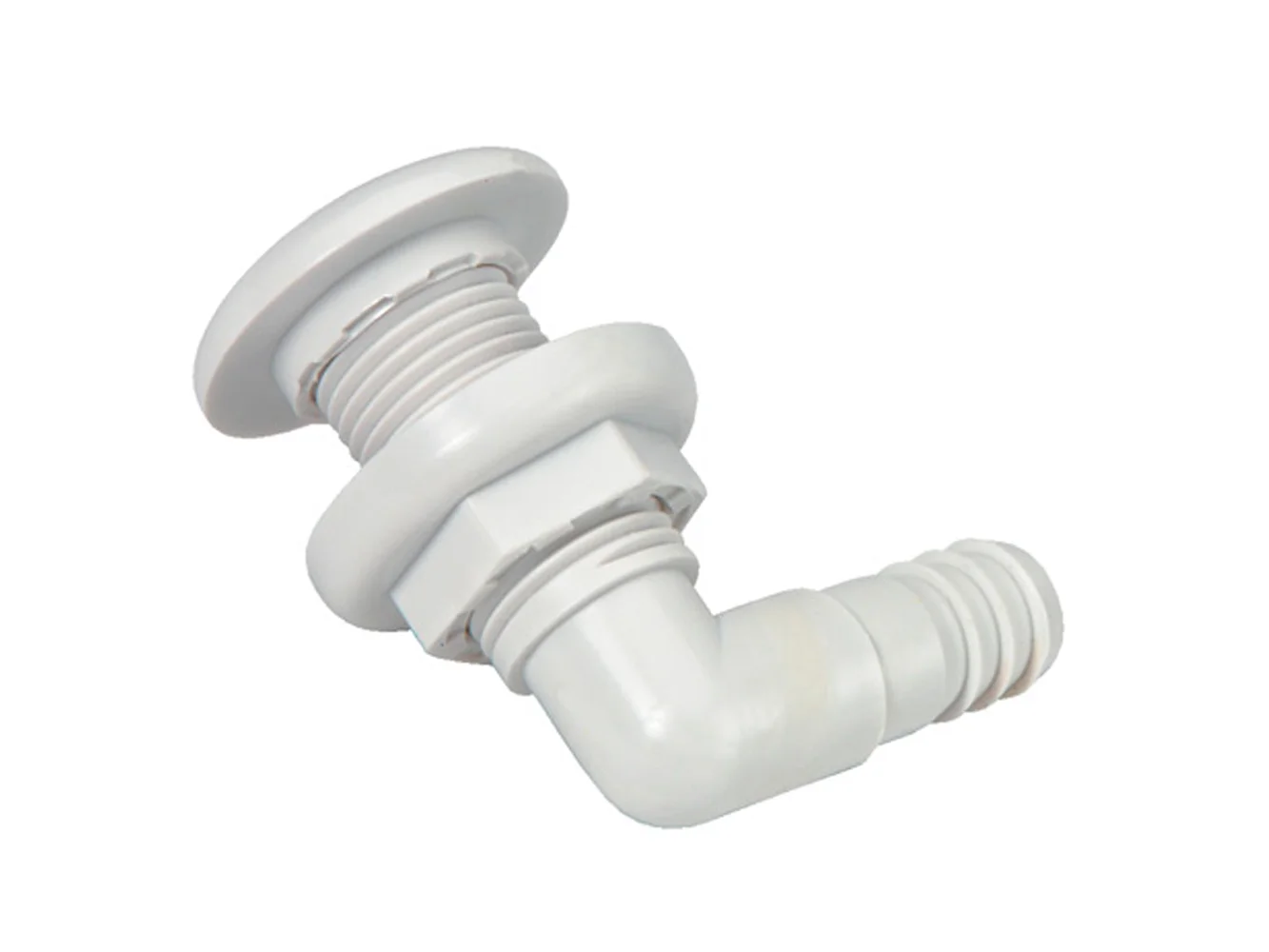 90 Degree Thru-Hull Connector – When looks are important, these are the 90 degree fittings to use. The outside nut is secured to the threaded shaft with a deck plate key. There no threaded section protruding through the head or in need of sawing so its always a neat, finished installation.