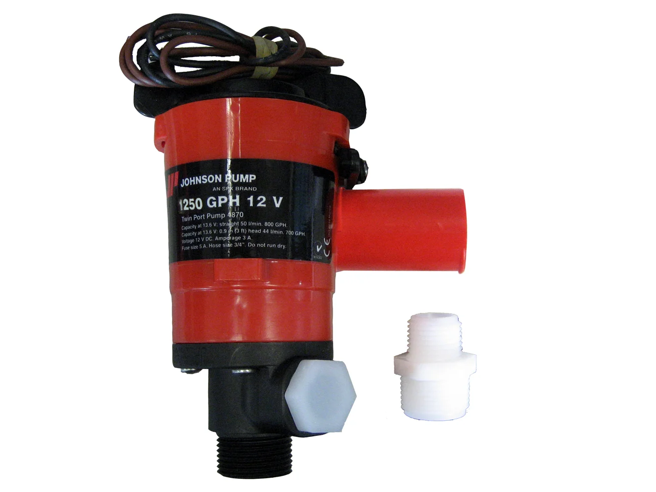 The 3/4″ tapered inlet connects directly to the sea cock and the upper outlet port provides a continuous flow of water through the 1-1/8″ discharge to livewell. Does not include Dura-Port. while the lower outlet port connects to the wash down pump through either a 1/2″ or 3/4″ ports.