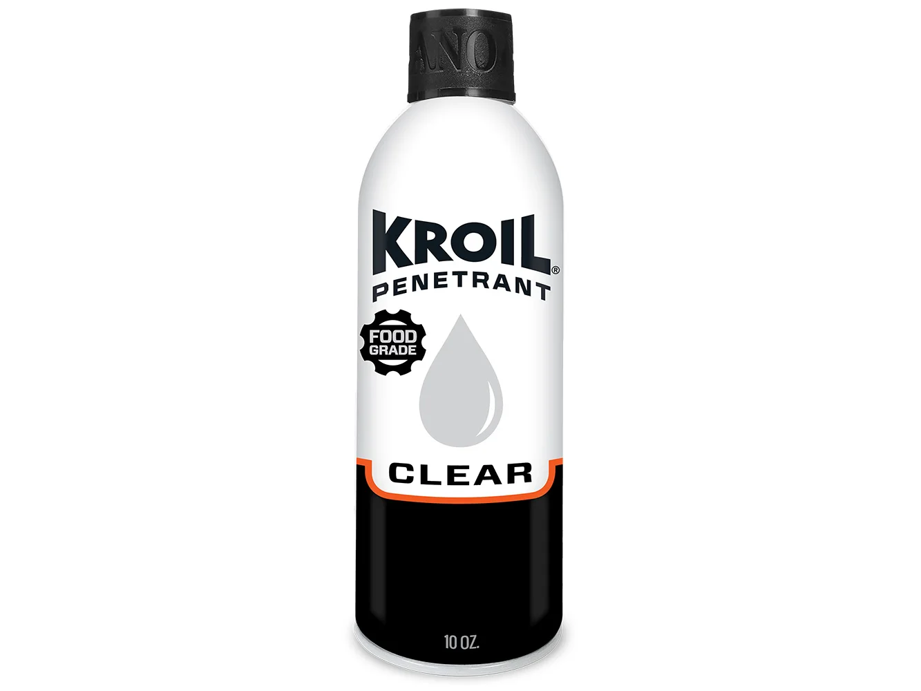 Kroil Clear food-grade penetrating oil works quickly to free rusted and seized nuts, bolts, fasteners, shafts, pulleys, joints, linkages, and more. It is odorless and non-staining and perfect for planned and unplanned maintenance, as well as equipment disassembly.