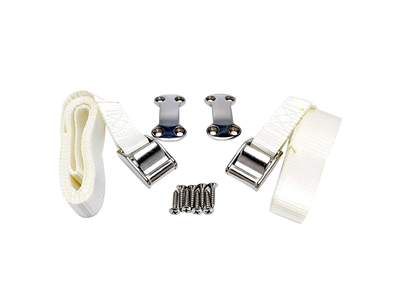 This Cooler Tie Down Strap Kit includes everything you need to secure your cooler to your boat, truck or trailer during travel.  The adjustable straps create a strong, secure hold and the included hardware is stainless steel, so it won’t rust or corrode.