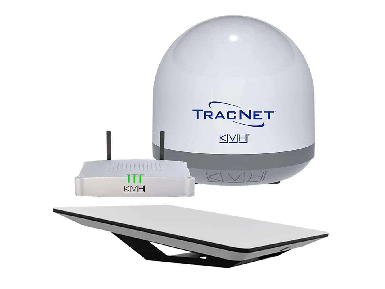 - Choice of KVH TracNet™ hybrid terminal with integrated global VSAT, 5G/LTE cellular, and shore-based Wi-Fi bridge, or TracPhone VSAT terminals
