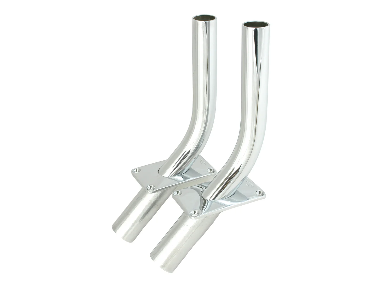 Attractive, Strong, and Bullet Proof all describe our Gunnel Mount Outrigger Holders. One piece flange construction. Plate, Tube and Bar-Pin are all cast simultaneously for the ultimate in strength. Curved Tube has Solid End Plug with Deep Slots to assure long service and reliability. Tubes are made with Port and Starboard slot orientation to optimize fishing angle. Flange mounts flush with gunnel. When tube is removed, gunnel is unobstructed. Unit has three positions, straight up Running, angled out Trolling and straight back for Bridge Clearing. Originally designed by Lee’s in the 50’s and copied by nearly all our competition. However, no one rivals our durability, fit & finish. Chrome on Brass construction.