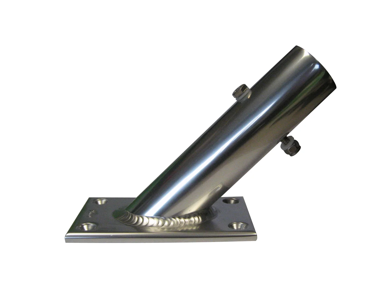 The AL7211CR (1-3/8″ID) is the perfect holder for boats in the 16 to 31 ft range. Its economical price and small footprint (3″x 5″) make it our most popular center rigger holder. The receiving tube of this marine grade anodized holder is set at a 45 degree angle. This is the perfect angle for boats where the mounting position is low and the cockpit is not extremely deep (e.g. mounting on T-Tops, Hard Tops, or Fly-Bridges). Compatible poles are 12 or 14ft in length and come standard in bright silver anodized finish with a Black Spike.