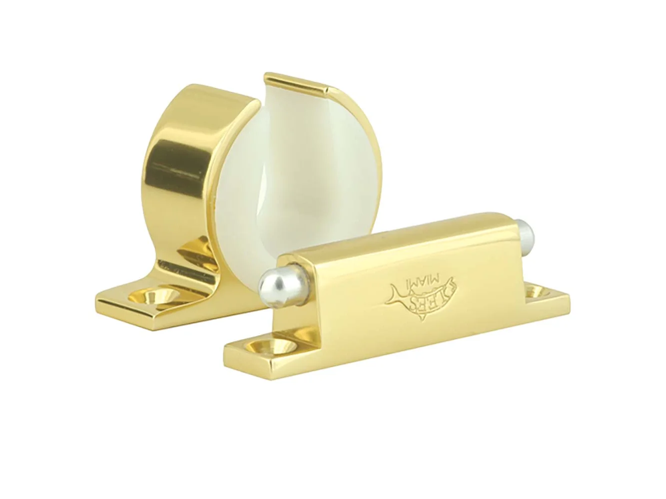 Individual sizes to fit the most popular big game reels. Constructed of Marine Grade Anodized Aluminum Bright Gold. The reel is attached to Hanger by spring-loaded pins riding in a bracket. Pins snap into harness lugs on top of the reel. The reel cannot swing since it is held in an upright position. Tip of Rod is placed into Locking End of set and the Nylon Ring is rotated to lock it in. Can be mounted Horizontally, Vertically, or Overhead. Available in sizes to fit most Penn, Shimano, Dual, and various other reels. Available in Gold Only.