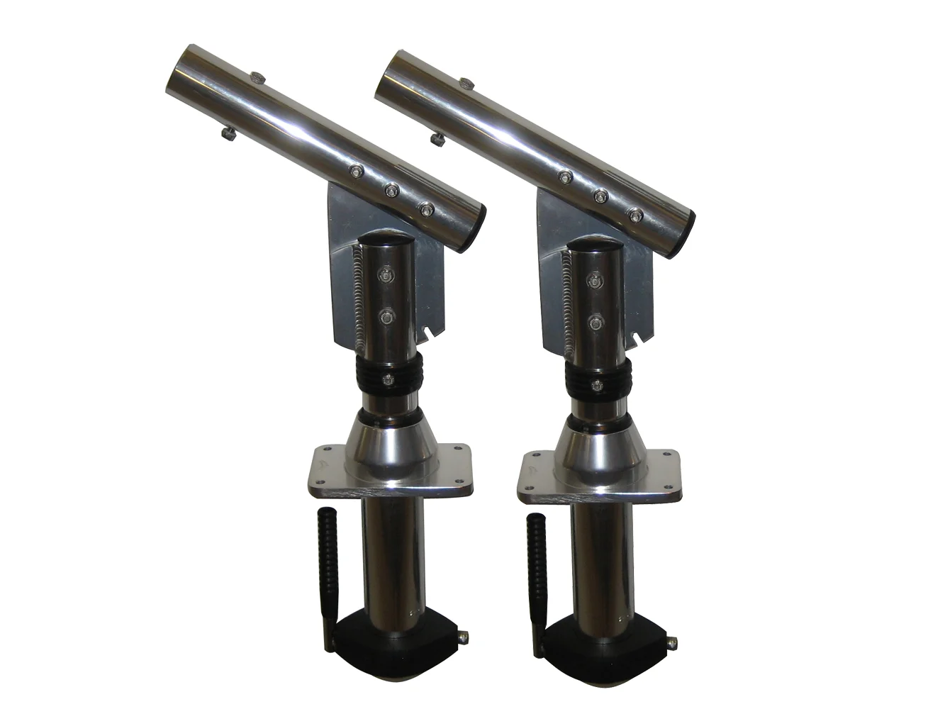 Below top operation. Fully locked in Running and 80 degree out Trolling positions. Locks when handle is up or down. Rotates when handle is to the left or right. Fastest Lay-Down on the market. Automatically locks in position when raising or lowering the pole. No knobs to loosen or tighten. Just pull down the Ridged Collar and lower or raise the pole. No ball bearing to rust. Internal Delrin Bushings and Nylon Bearing Surfaces provide smooth operation and prevent metal to metal contact.