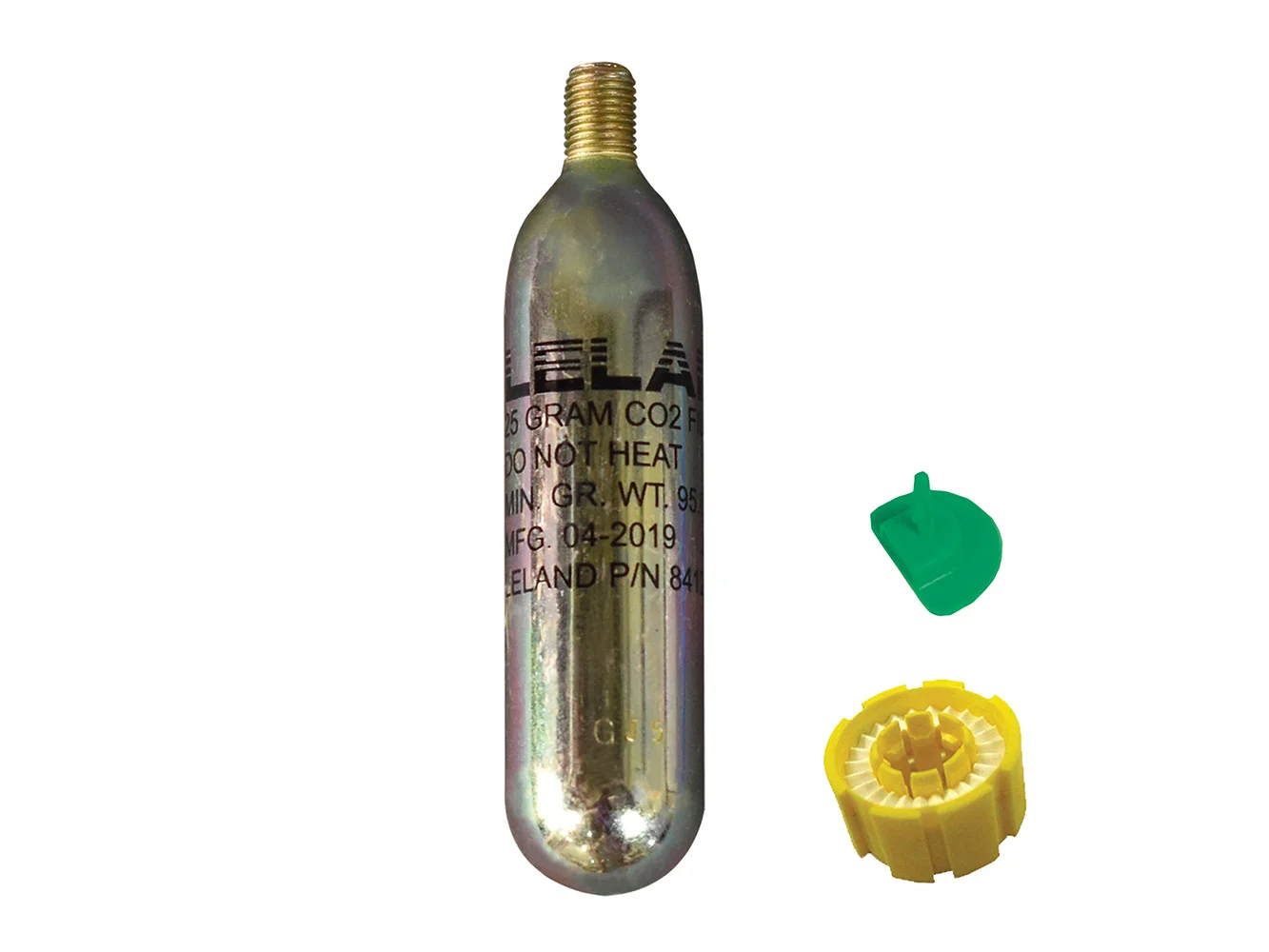 - Includes one 25-gram CO2 cylinder with 3/8" threads, Green Indicator Pin, and Yellow Bobbin/Water Sensing Element and Instructions