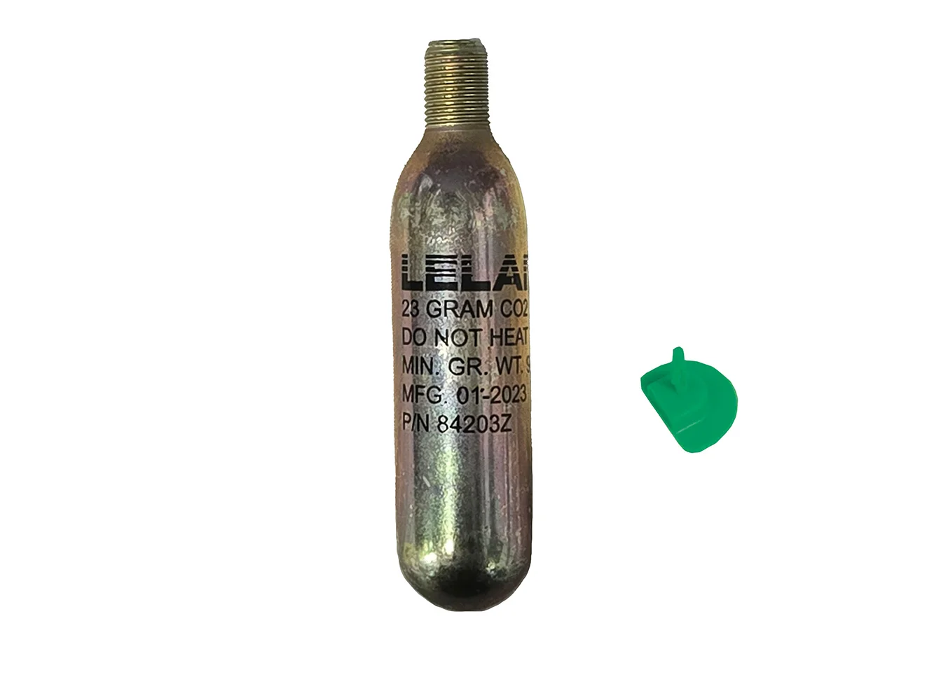 - Includes one 23-gram CO2 cylinder with 1/2" threads, Green Indicator Pin, and Instructions