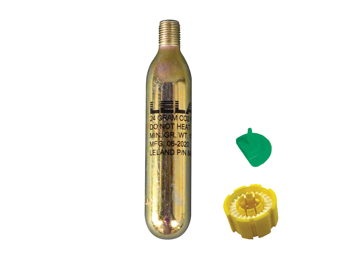 - Includes one 24-gram CO2 cylinder with 1/2" threads, Green Indicator Pin, Yellow Bobbin/Water Sensing Element, and Instructions