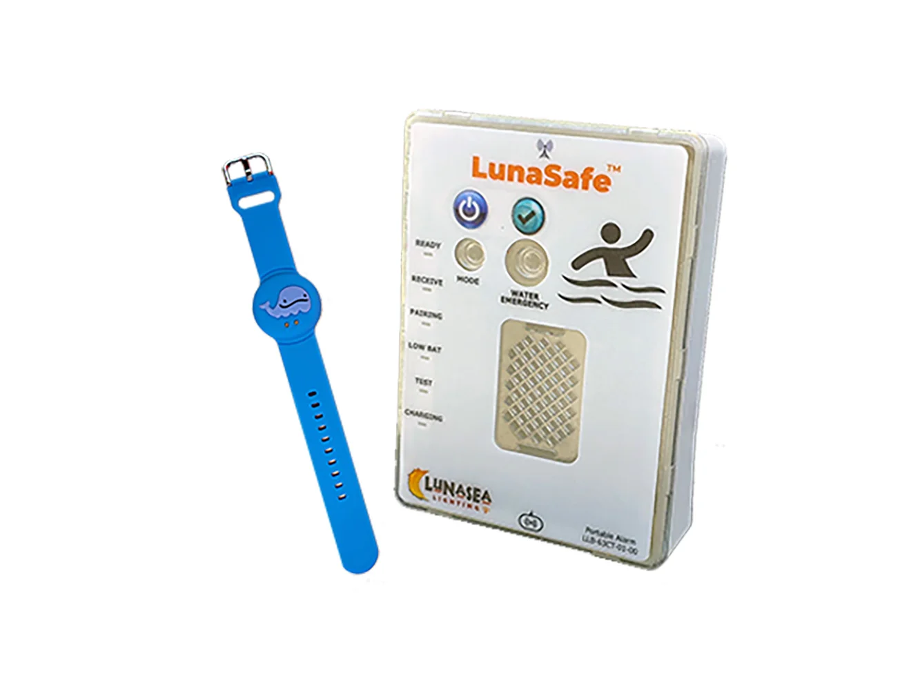 Lunasea Lighting's super soft blue silicone case, wrist strap, safety water activated transmitter for kids.