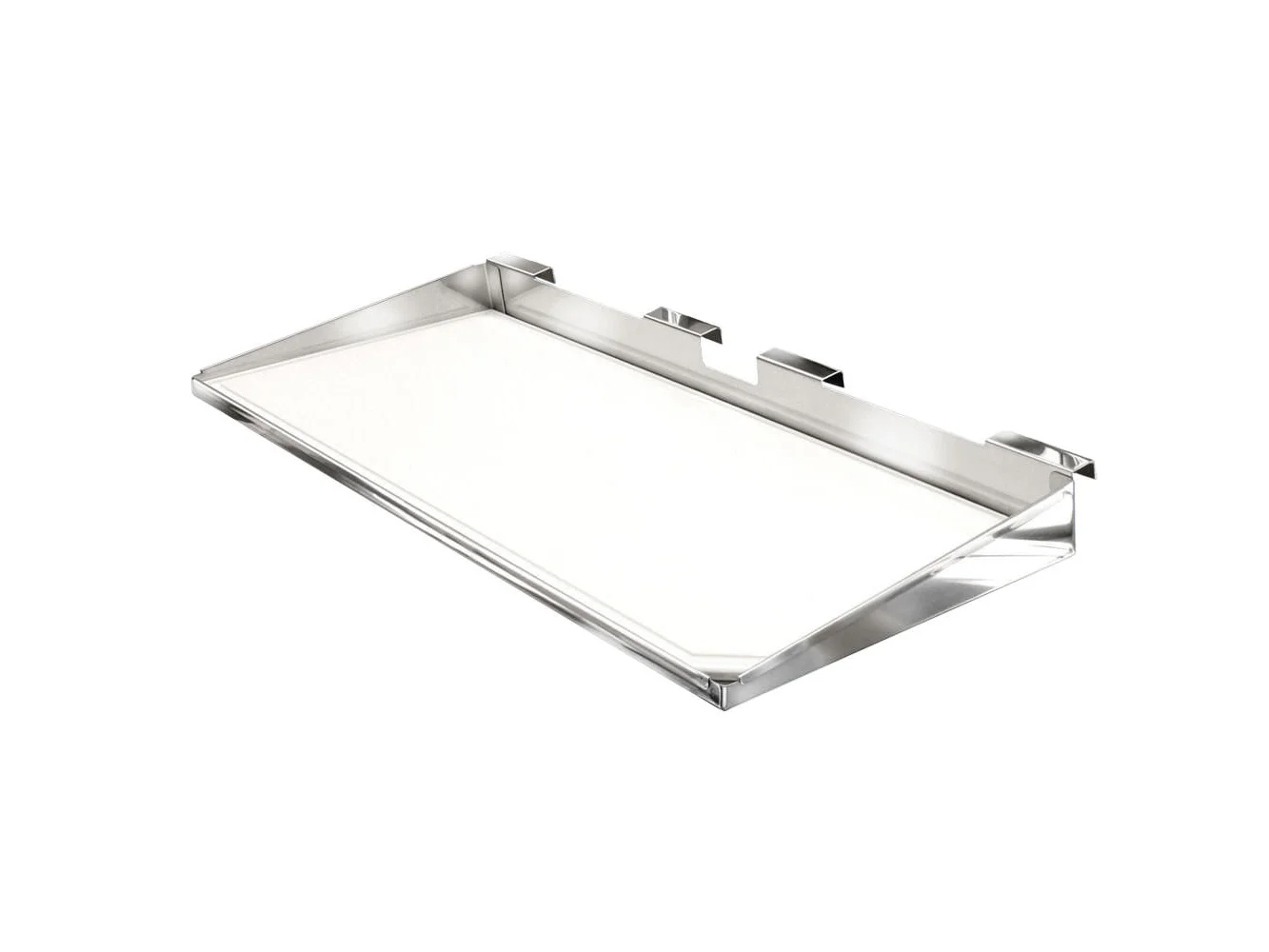 This 18-8 mirror polished marine grade Stainless Steel serving shelf includes a removable cutting board. The board is manufactured using a high density polyethylene material which is FDA approved, UV stabilized and will not crack, mold, mildew, or retain any unwanted odors. Cutting board is also replaceable.
