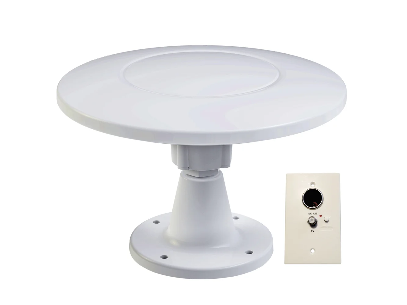 The UFO X RV is the latest in digital technology and high performance for TV Reception in your caravan, Motohome or RV. It has the highest gain of any TV antenna for its tiny 27cm Diameter. It might be small but its packed with powerful technology, supplied with a Wall Plate that has an Antenna socket and Cigarette plug for RV installation.