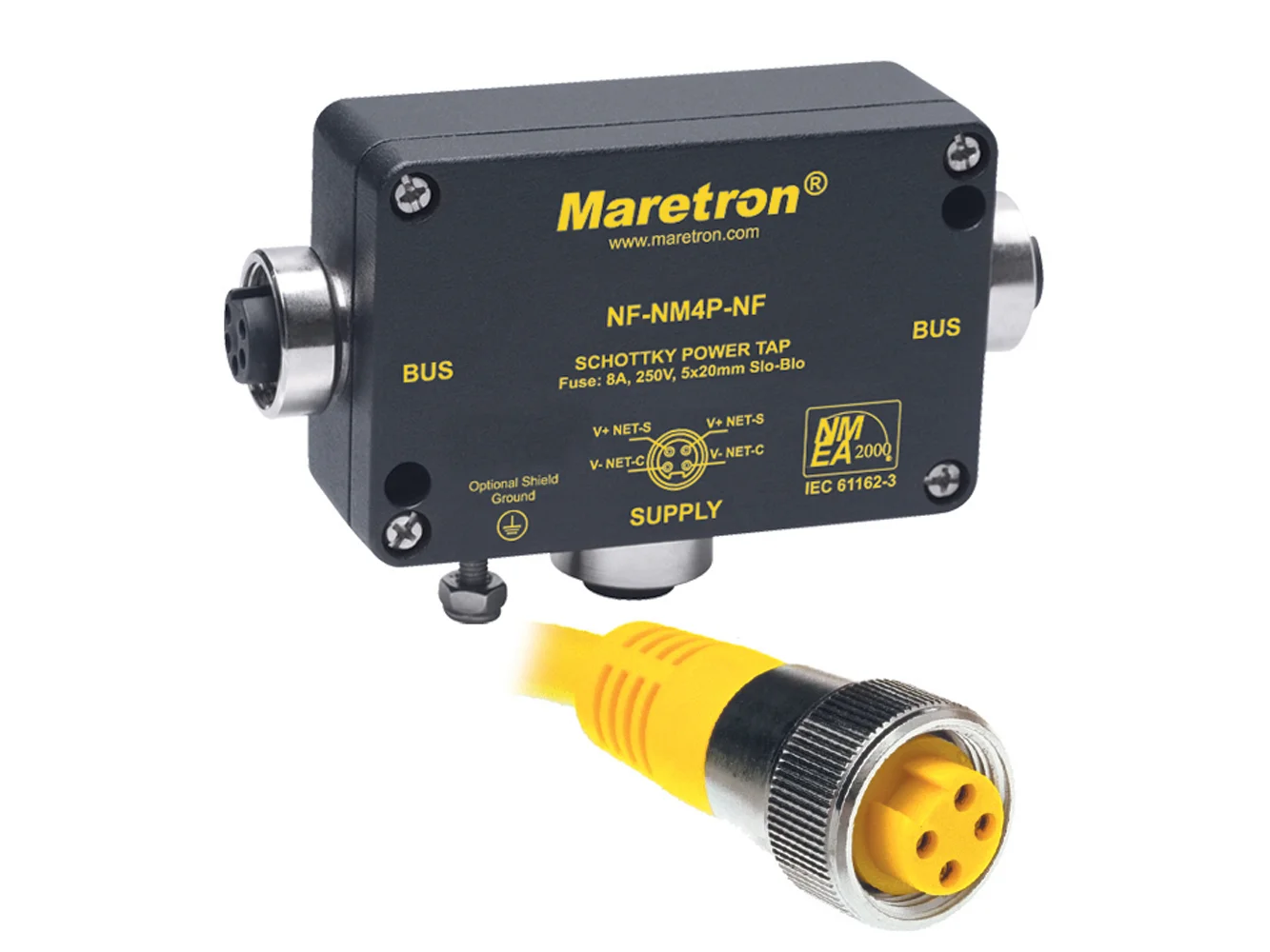 A powertap is connected to a network backbone just like any Tee but rather than connecting a device their purpose is to provide “bus” power. Typically a Powertap is placed as central as possible between total devices on backbone. Maretron Powertap uniquely provides two power inputs permitting doubled power provision for devices.