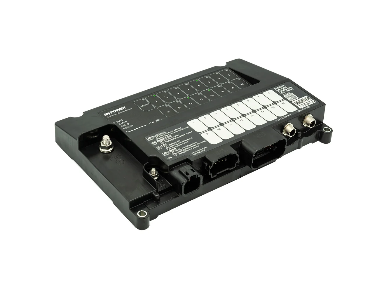 For larger breakers and more circuits, the MPower® CLMD16 is a 16-Channel DC Load Controller Module. Four of the 16 breakers handle a maximum of 25 amps, and twelve breakers handle a maximum of 12 amps, with a total current capacity of 125 Amps. Additionally, circuits can be paralleled.