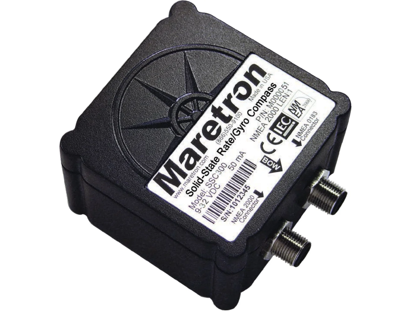 Maretron’s SSC300, implementing the second generation of Maretron’s award-wining compass technology, is a solid state, rate gyro electronic compass that provides better than 0.7x heading accuracy through q45x of roll and pitch angle, and better than 1x roll and pitch accuracy in static conditions. Each SSC300 is factory calibrated for maximum accuracy. It delivers precise, reliable heading information ten times per second, plus vessel attitude including pitch and roll readings once per second. A micromachined 3-axis rate gyro is used, in conjunction with a 3-axis accelerometer, by advanced stabilization algorithms to provide accurate, stable readings during dynamically changing conditions such as hard turns or rough seas, making it an ideal heading sensor for autopilot or radar overlay applications.