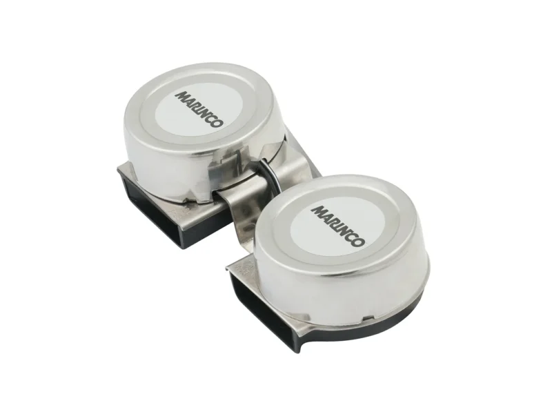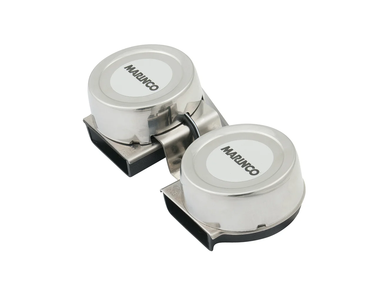 The Mini Twin Electric Horn has two totally sealed sound units with type 304 stainless steel covers, diaphragms and mounting bracket.