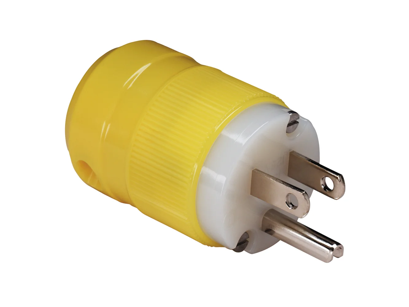 The 5266CR 15A 125V straight blade male shore power plug features corrosion resistant contacts and terminals. The body is made of yellow nylon with a ribbed design for secure grip.