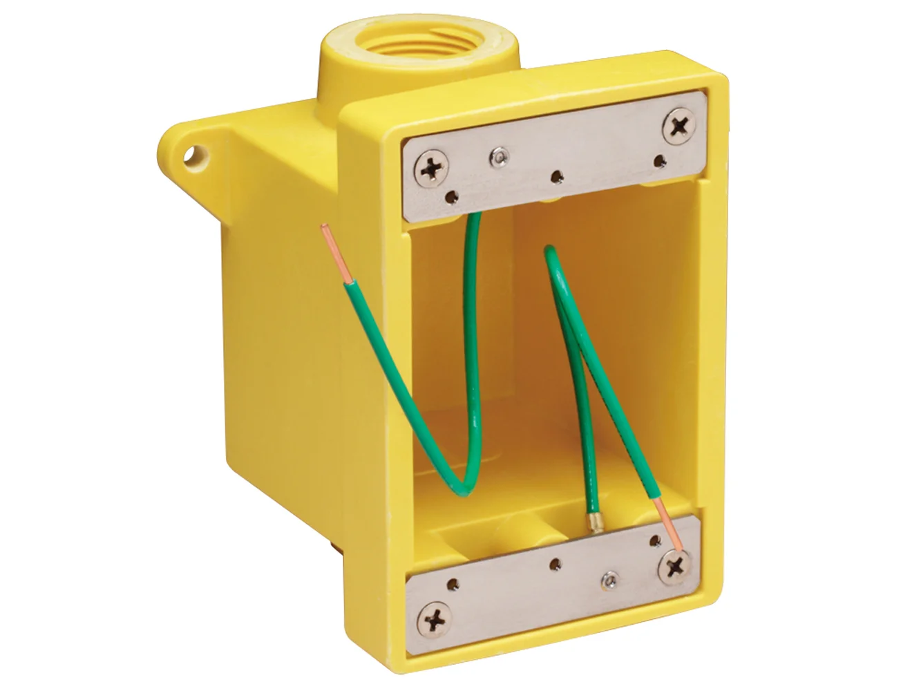 This yellow fiberglass box with two 3/4″ K.O. holes accepts 15A, 20A, 30A and 50A receptacles and 7420CR and 7788CR covers.