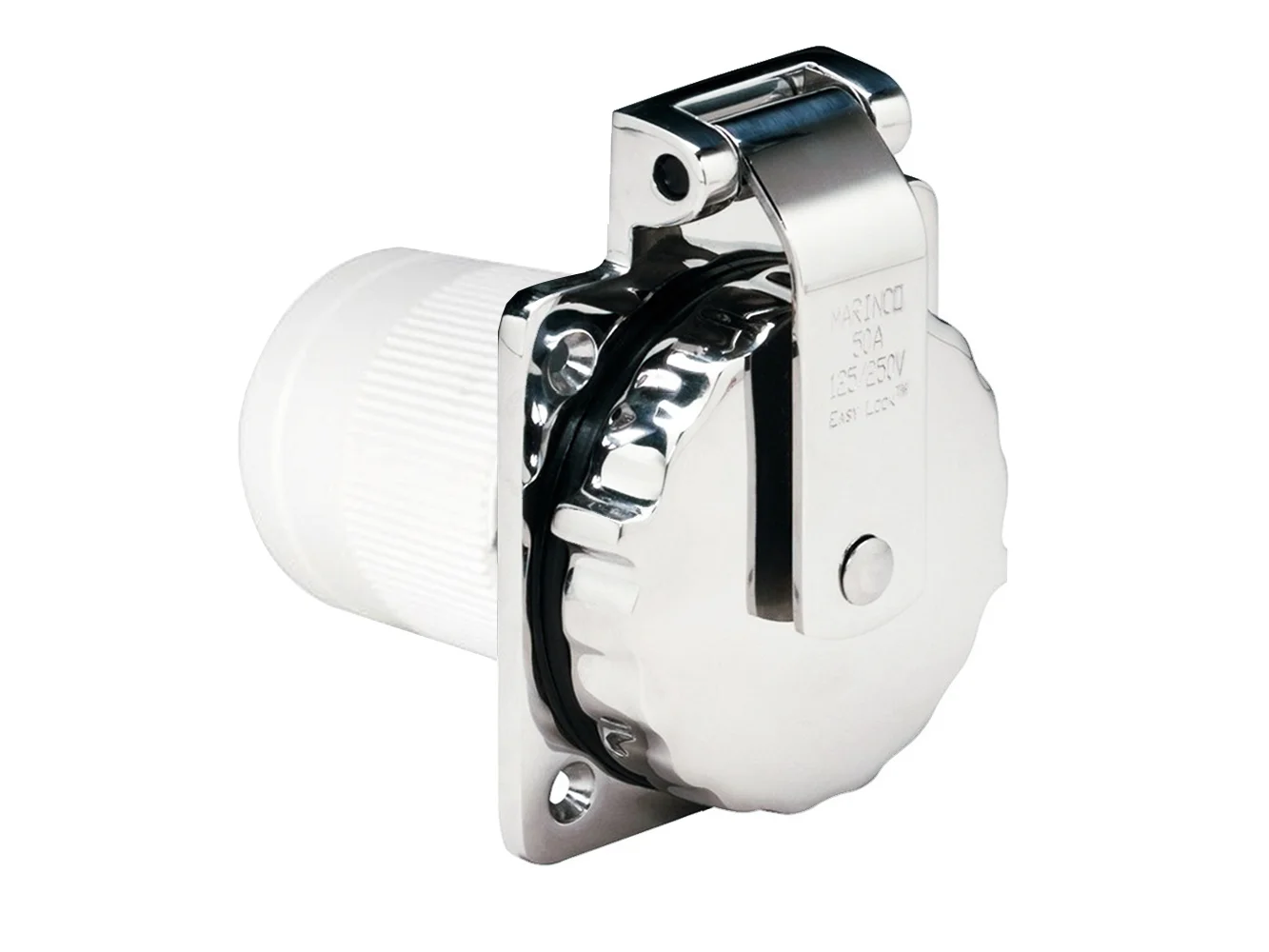 Easy Lock™ inlets have a threaded boss that will accept threaded cordsets as well. The Easy Lock™ system is a standard feature on some Marinco® 30 amp and 50 amp inlets and cordsets.